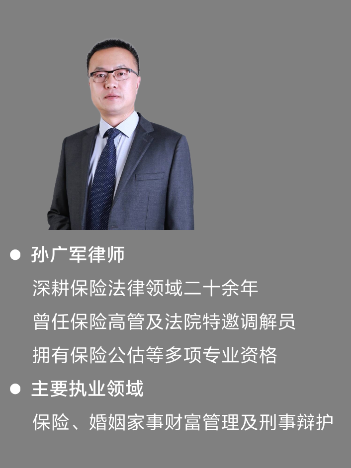 孫廣軍律師,保險法律領域深耕二十余年。曾任保險公司高管人員及法院特邀調解員,擁有保險公估等多項專業資格。專注于保險、婚姻家事財富管理以及刑事辯護。