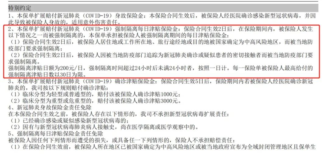 [2] 復(fù)星聯(lián)合愛無憂意外傷害保險(xiǎn)單-特別約定》第二條:本保單擴(kuò)展賠付新冠肺炎(COVID-19)強(qiáng)制隔離每日津貼保險(xiǎn)金:保險(xiǎn)合同生效2日后,在保險(xiǎn)期間內(nèi),被保險(xiǎn)人發(fā)生以下情況之一而被強(qiáng)制隔離的,本保單承擔(dān)被保險(xiǎn)人被強(qiáng)制隔離期間的每日津貼保險(xiǎn)金:
