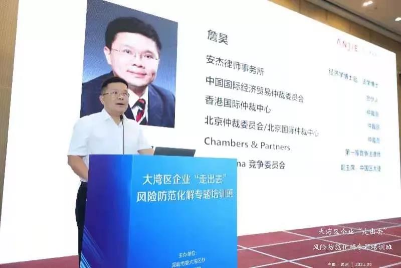 2021年9月26日上午,大灣區企業“走出去”風險防范化解專題培訓成功舉辦,該會議由深圳市委大灣區辦、深圳市工商聯、深圳市貿促委聯合主辦,深圳市藍海大灣區法律服務研究院承辦。培訓于26日、27日兩日進行,來自比亞迪股份有限公司、深圳順豐泰森控股(集團)有限公司等73家企業的高管、法務、合規人員等百余人參加培訓。安杰律師事務所合伙人詹昊博士受邀列席發言。