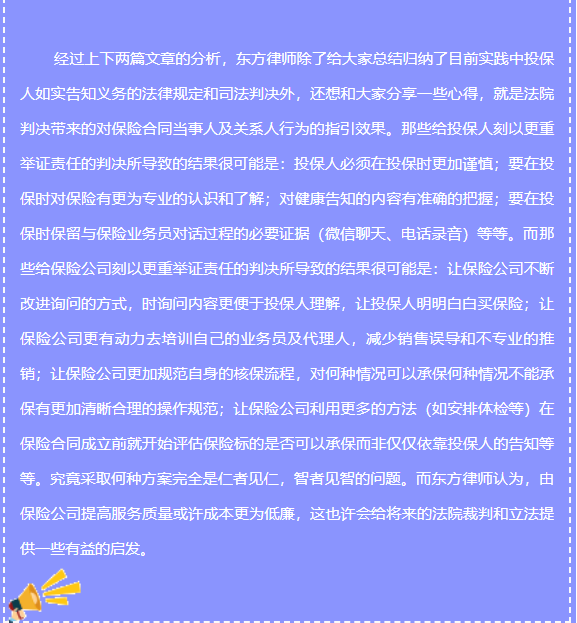 在上期的文章中,東方律師與大家分享了投保人如實告知義務的管轄法院的選擇、司法實踐中如何認定。保險公司是否進行了有效詢問、如何認定投保人未如實告知是“故意”還是“重大過失”。本期,東方律師就繼續和大家分享一些如實告知義務中可能會涉及的相關問題: