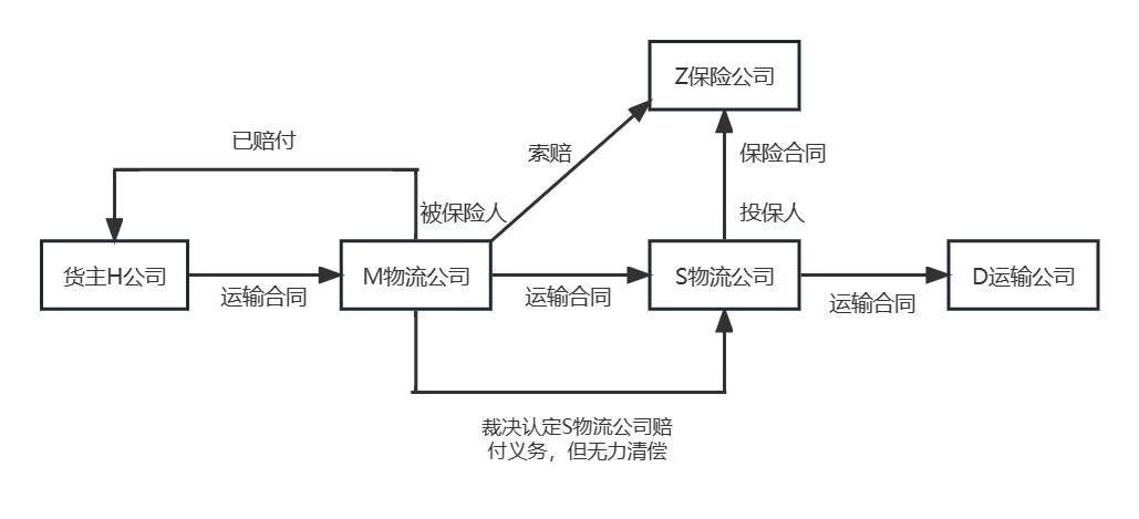 (1)從本案運輸合同鏈條來看,貨主H公司與投保人S物流公司之間沒有意思聯絡,貨主很難獲取保單并主張權利。特別是M物流公司對H公司賠償后,作為被保險人的H公司損失已得到彌補,亦不能主張保單權利[2]。