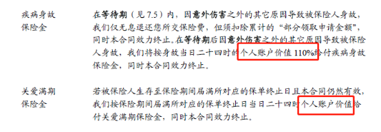 也有觀點認為,即使保險公司沒有在客戶未申請情況下主動向客戶支付滿期金的義務,但保險公司可否從提升客戶服務的角度,在客戶未申請情況下主動向客戶支付滿期金呢?筆者認為,一般情況下,此種做法也是不合適的,為何說不合適呢?因為通常情況下,含有滿期金責任的保險產品,一般也同時含有身故責任,且有可能身故保險金和滿期保險金的金額還不一樣,以下面這款萬能險產品為例,疾病身故保險金是身故當日的個人賬戶價值的110%,而滿期保險金則是保單終止日當日的個人賬戶價值。