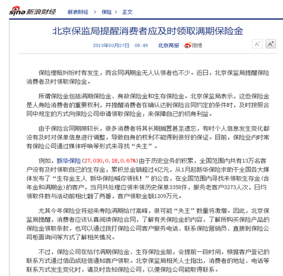 其實早在2012年底,新華人壽保險股份有限公司就在全國廣泛開展“尋找生存金主人”活動,以短信通知、電話回訪、上門拜訪等方式提醒客戶關注自己的保單權益,并在各大媒體登載“生存金主人 新華保險喊你領錢!”相關文章,而且當時原北京保監局也提醒廣大客戶及時申請領取滿期金以維護自身權利,如下圖所示: