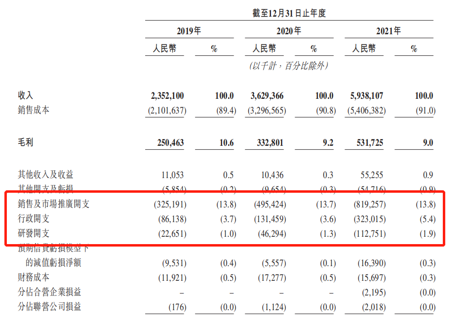 2019年-2021年,圓心科技的銷售及市場(chǎng)推廣開支分別為3.25億元、4.95億元和8.19億元,占比分別為13.8%、13.7%和13.8%