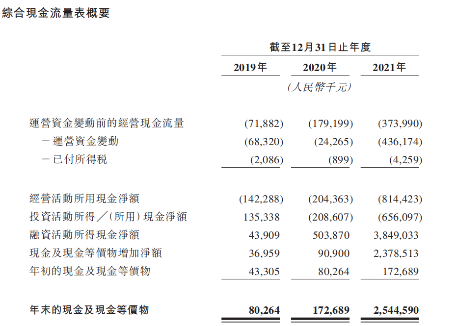 大規(guī)模的融資使得圓心科技現(xiàn)金流十分寬裕。2018圓心科技的現(xiàn)金及現(xiàn)金等價(jià)物為4330.5萬元,截至2021年末,則激增至25.44億元。