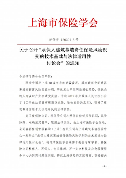 5月20日,為了使保險公司、再保險公司在建筑幕墻責任保險承保前做好風險識別,風險防范,準確厘定費率,理清法律關系,由上海市保險學會發起,睿再保創管理咨詢(上海)有限公司、上海建筑幕墻檢驗中心協辦,特邀請保險學會法律專委會專家學者、各保險公司核保人、再保人、專業律師、萬一安全科技及應急救援服務中心共同商討題述問題,鑄就上海保險的工匠精神。