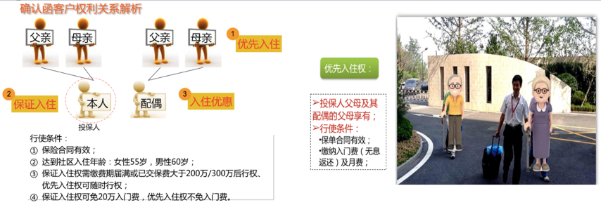 舉例來說,李先生投保了泰康的養老年金保險,按10年每年繳納20萬的保費,繳費10年即滿足總保費200萬的額度。李先生和其妻子擁有保證入住的資格(申請后十八個月內一定安排他們入住),李先生的父母及其愛人的父母擁有優先入住資格(優先于押金入住方式)。