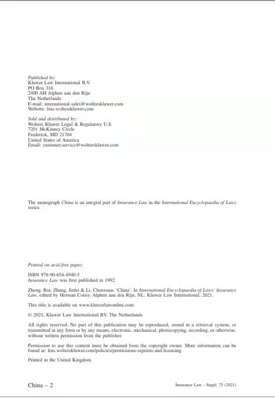恭喜睿再保險(xiǎn)精英俱樂部會(huì)員鄭睿教授和兩位學(xué)者合作完成了荷蘭威科集團(tuán)出版的國(guó)際保險(xiǎn)法百科全書中國(guó)保險(xiǎn)法卷,為英語(yǔ)世界講述中國(guó)保險(xiǎn)法的故事貢獻(xiàn)了一點(diǎn)力量。