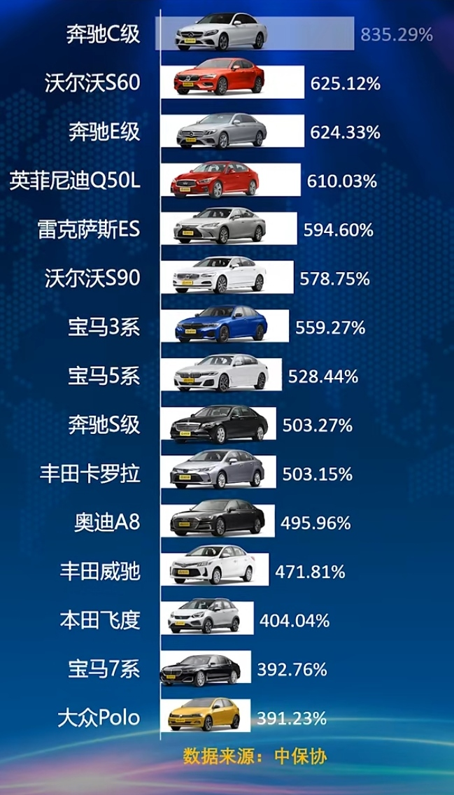 排在首位的當屬奔馳C級,具體數(shù)字是835.29%,相當于把每個零件拆了,可以買8.3輛同樣的車!