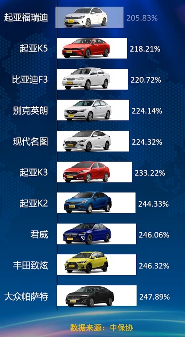 “零整比”較低的兩款車分別是起亞福瑞迪和起亞K3,只有205%和218%,買得起也養(yǎng)得起。